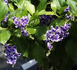 Variegata 和名/タイワンレンギョウ 英名/Brazilian skyflower クマツヅラ科デュランタ属 この属は北アメリカ南部から南アメリカに30〜36種があるとされ、 常緑の低木または高木で、茎にとげがあり、よく枝を広げるので生垣と しても利用されるそうです。 その1種のヴァリエガタを見かけることが多くなりましたが、日本では 主に鉢植えで売られています。 よく分枝して枝垂れた枝の先に、小さい紫色の花を多数咲かせますが、 ほかにも白色のもの、覆輪のものなどがあり、葉も白や黄色の斑が入る 種類があり、変化に富むようです。 果実は黄色い球形で、長く枝についています。 葉が黄色の「ライム」という種が暖かい地方で庭園樹として利用される そうです。 (追而:7月18日の誕生花/花言葉・・ハイビスカス/勇気ある行動 7月19日の誕生花/花言葉・・トリカブト/心を傷つける言葉) |