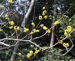 | 【備 考】学名/Lindera obtusiloba 別名/ウコンバナ、シロヂシャ クスノキ科クロモジ属 暖地の山林に生える落葉樹で、高さ3〜7m程。 樹皮は暗灰色でつるつるしている。 3〜4月、葉が出るのに先だって、前年の葉腋に無柄の散形花序を つけ、黄色の芳香のある花を多数開く。雌雄別株。雄花序には6〜 7個の雄花がつき、花被片が6個、雄しべが9個あり雌しべは退化 している。雌花は5〜6個つき、花被片が6個、仮雄しべ9個、雌 しべ1個。 葉は互生し、長さ5〜15cmの広卵円形で、多くは先が3浅裂。 果実は秋に黒紫色に熟する。 材質にも芳香があり、楊枝や細工物に利用される。 |