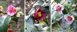 | 【備 考】学名/Camellia wabisuke ツバキ科ツバキ属 ツバキとチャノキとの交雑種といわれ、中国原産ともいわれるがはっきりは しない。 花は一重でツバキより小さく、筒状で不規則に裂け、子房に毛が密生するも のが多く、これが特徴となる。 花期11〜4月。結実はしない。 写真は左から「オワリワビスケ」「クロワビスケ」「フクリンワビスケ」と の記載があった品種。 他に知られているのは「白ワビスケ」「紅ワビスケ」「コチョウワビスケ」 「有楽椿(太郎冠者)」など。 |