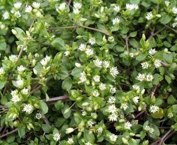 | 【備 考】学名/Stellaria media ナデシコ科ハコベ属 道端、空き地、畑など、普通にみられる2年草で、春の七草の ひとつ。ハコベに似ているが、全体にやや小さく、茎が暗紫色 を帯びるものが多い。 葉は濃い緑色で、長さ1cm程度。茎は少し立ち上がるがウシ ハコベほどには高くならず、地面を這うように生長する。 花期3〜9月、茎先に小さい白い花を多数つけるが、花弁は5 枚。これが深く基部近くまで切れ込んでいるので10枚のよう に見える。雄しべは1〜5個。 旧大陸の原産とされ、日本では明治時代に確認されたが、今で は全国に広まっている。 |