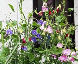 | 【備 考】学名/Lathyrus odoratus 和名/ジャコウレンリソウ(麝香連理草) マメ科レンリソウ属 シチリア島原産のつる性越年草、4m程度まで成長する。 葉は1対の小葉からなり互生。 花は腋生で、長い花柄の先に1〜4個の蝶形花がつき、花期 4〜5月、花色はピンク・白・赤・紫など。 最近普及してきたヒロハノレンリソウ(宿根スイトピー)は ヨーロッパ原産の多年草で、開花時期がやや遅く、小葉が細 長い。 園芸品種には冬咲き系、夏咲き系、大輪多花性などがある。 |