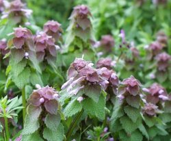 | 【備 考】学名/Lamium purpureum シソ科オドリコソウ属 ヨーロッパ原産の越年草で、東アジアや北アメリカにも帰化している が、我国で発見されたのは明治26年、東京の駒場であったという。 繁殖力の強い雑草で、現在では都市周辺の道端や空き地に群生してい る。高さ10〜25cmで、茎は四角形。葉は下部では卵形で柄があ り、上部では三角状の卵形で密集してつき、赤紫色を帯びてほこりを かぶったように見える。網目状の小じわが目立ち、ふちに鈍い鋸歯が ある。 花は4〜5月に咲き、上部の葉の腋に長さ1cmほどの唇形花が淡紅 色につく。 |