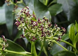 | 【備 考】学名/Aucuba japonica ミズキ科アオキ属 宮城以西の低山や平地の林の中に生え、庭木としても世界各地で 植えられている常緑の低木。高さ1〜3mで、光沢の有る緑色の 葉と秋に赤く熟す実が美しい。 若い樹皮は緑色。葉は対生し、長さ5〜18cm幅2〜10cm で先がとがった長楕円形。質は厚く、ふちに粗い鋸歯があるが老 木では消失する。 4月頃、茎の先の円錐花序に紫褐色ときに緑色の、直径約7mm 4弁花を咲かせる。雌雄別株で、雄花序は7〜15cmで雄花は 雌しべが退化し、雌花序は2〜5cmと小さく、花には雄しべを 欠いて雌しべが1個ある。 果実は1.5〜2cmの楕円形で秋に赤く熟し、翌春まで残る。 果実が黄色に熟するキミノアオキ、白色になるシロミアオキなど や園芸品種も多い。 |