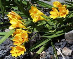 | 【備 考】学名/Freesia hybrida 別名/アサギスイセン アヤメ科フリージア属 南アフリカのケープ地方原産で、11種ほどがあり、それから育成 された園芸種で半耐寒性の球根草花。日本には明治末期に入った。 草丈40〜50cm、葉は剣状で、これが数枚〜10枚生じた後に 弓状に曲がった花茎が伸びてその先が穂状花序となり数花をつける。 多くの園芸品種があり、花色も黄・白・紫・ピンク・赤など多彩。 八重咲きの品種は雄しべが花弁化したもの。 |