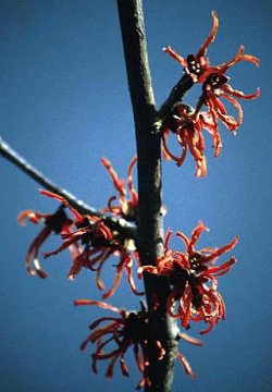 | 【備 考】学名/Hamamelis X intermedia マンサク科マンサク(ハマメリス)属 東アジア、北アメリカ東部にも数種が分布する落葉低木で、葉は 卵形、倒卵形で秋の紅葉が美しい。 花は4本の細い線状の花弁をつけ、開花期2〜4月。 写真の Hamamelis X intermedia はマンサク(H.japonica)と シナマンサク(H.mollis)との雑種で、多くの品種が作られて日 本に輸入されている。 原種は花弁が黄色いものだが、この種では赤色のダイアナ(Diana) オレンジ色のエレナ(Jelena)黄色のムーンライト(Moonlight) などがある。 マルバマンサクの1品種でアカバナマンサクと呼ばれるものも花弁 全体が赤色を帯びる。 |