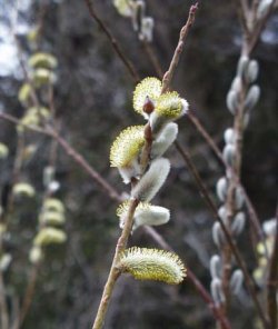 | 【備 考】学名/Salix gracilistyla 別名/カワヤナギ、エノコロヤナギ ヤナギ科ヤナギ属 各地の山野の水辺に見られる落葉低木で、高さ3mになることがあり 庭木としても用いられる。 よく枝分かれし、枝は弓状になって斜上する。冬芽は灰白色の軟毛が 密生し、帽子状になった赤褐色の鱗片1個がある。 3〜4月、葉が開く前に開花。雌雄別株で、雄花穂は長さ3〜6cm、 赤い葯から黄色い花粉を出す。雌花穂は長さ2〜4cmで雄花穂より 細い。雌花は花のあとのびて9cmほどになり、一方に傾く。 葉は互生で、長さ7〜13cmの長楕円形、先がとがり基部は円形。 若葉は両面に毛が密集する。 果実は2裂して白い綿毛に包まれた種子を出す。 |