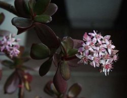 | 【備 考】学名/Crassula portulacea 別名/フチベニベンケイ、カゲツ(花月) ベンケイソウ科クラッスラ属 この属は大小変化に富み、葉は対生、花は白・ピンクなど。南アフリカ 東アフリカ、マダガスカルなどに300種以上がある。 ポルツラケアは南アフリカ原産で、高さ1〜3mの低木。 葉は楕円形ないし卵形、長さ3〜4cm、緑色肉厚で光沢がある。 茎は太く、均整のとれた盆栽風に育つ。 老成すると冬から春にかけて開花し、花は星形で多数が頂生。花径0.5 cm程度で、桃白色〜淡桃色。 本名よりは「金のなる木」「成金草」として知られ、台湾やタイでも人 気があり、原産地では根を食用にすることがあるという。 |