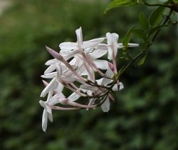 | 【備 考】学名/Jasminum polyanthum モクセイ科ジャスミン(ソケイ)属 強い芳香を放つことで知られるジャスミン属は、旧世界の熱帯から 温帯にかけて分布し、約200種とも450種あるとも言われる。 つる性、または低木。落葉するものも常緑のものもある。 ハゴロモジャスミンは中国南部原産で、日本には明治末期に渡来、 鉢植えや垣根にからませたりして楽しまれる。 つる性で他のものにからまって2〜3mほど伸び、葉は小型で対生 する長楕円形の小葉数枚からなる複葉。 冬から初夏にかけて、枝先に直径約3〜4cmの白い筒状花を多数 つけ、花の先端は4〜5裂して芳香を放つ。 花の筒状の部分や蕾は淡いピンク色。 |