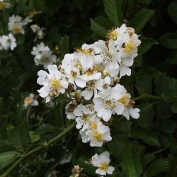 | 【備 考】学名/Rosa multiflora バラ科バラ属 野原や川辺などに普通に見られる落葉低木で、よく枝分かれして 2mほどの高さになる。枝には小さく鋭い刺が多い。 葉は互生し、奇数羽状複葉。小葉が2〜4対あり長さ2〜5cm の卵形ないし長楕円形、光沢を欠く。 花期5〜6月、枝先の円錐花序に香りの良い白い花を多数つける。 花の直径2〜2.5cmで、花弁は5個。雄しべ多数が目立ち、花 柱は壷状の花床から出て合着する。 果実は直径6〜9mmで球形、秋に赤く熟す。 |