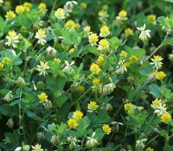 | 【備 考】学名/Trifolium dubium 別名/キバナツメクサ、コゴメツメクサ マメ科シャジクソウ属 ヨーロッパ〜西アジア原産の1年草で、日本には明治後期に渡来 したとされ、各地で野生化している。主に中部地方以西で見られ 次第に範囲を広めている帰化植物。 草丈20〜40cm、よく分枝して横に拡がり群生する。 葉は3小葉からなり、長さ0.5〜1cmの倒卵形。 5〜7月、黄色で長さ3〜4mmの小さい花5〜20個が球状に 集まって咲く。球状の花の塊は直径7〜10mmほど。 |