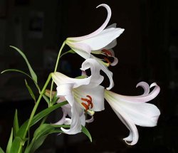 | 【備 考】学名/Lilium japonicum ユリ科ユリ属 日本特産で、中部地方以西、四国、九州の一部に分布する。 高さ50〜100cmで、低い山地の草地などに生える多年草。 葉は短い柄を持ち、長さ8〜15cmの披針形で濃緑色、10数 枚がまばらにつく。 6〜7月、直径10〜15cmで漏斗状の花が横向きないし斜め 下向きに咲き、1本の茎に2〜3花がつく。花の色は淡紅色から 白色まで、濃淡に差がある。雄しべの色は赤褐色。 |