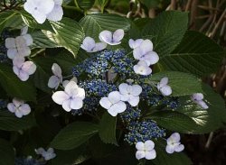 normalis 別名/ガク、ガクバナ、ガクソウ ユキノシタ科アジサイ属 暖かい地方の海岸沿いに生え、古くから園芸化されて庭などに植え られている落葉低木。高さ1〜2m、葉は長さ5〜15cmの広卵 形または倒卵形で、表面に光沢がある。 6〜7月、枝先の散房花序に小形の両性花多数と装飾花をつける。 両性花は淡紫色で、10個の雄しべと花柱が3〜4個あり結実する。 装飾花は広卵形で直径3〜5cm、淡紅色・淡青紫色・白色など。 |