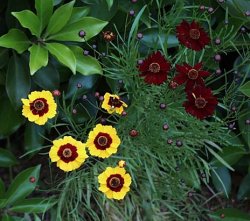 | 【備 考】学名/Coreopsis tinctoria 別名/ジャノメソウ キク科ハルシャギク属 北アメリカ中西部〜南部、ミネソタ、ワシントン、カリフォルニア州 にかけて分布する1年草で、日本には明治初期に渡来。 秋に種を蒔いて、芽生えた苗が冬を越し、春には草丈30〜60cm の細い茎が多数伸びる。茎はよく分枝し、葉は羽状複葉。 6〜7月、茎の先に直径3〜4cmの頭花をつけ、舌状花は鮮黄色で 7〜8枚、先端が浅裂し、基部に赤褐色の斑紋があって蛇の目状に見 える。 園芸品種には矮性のもの、八重咲き、蛇の目を欠くもの、花色が褐色 や赤紫色のものなどがある。 写真は本来のハルシャギクと赤紫色の花の品種が草むらに野生化して いたもの。 |