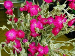 | 【備 考】学名/Lychnis coronaria 別名/フランネルソウ 英名/rose campion, mullein pink, dusty miller ナデシコ科センノウ(リクニス)属 アフリカ北西部、ヨーロッパ東南部、中央アジアに分布する2年草 または多年草。江戸時代末期に渡来した。 草丈30〜80cmで、株全体が密生した白銀色の綿毛に覆われて いる。茎は直立し上部で分枝して、その先端に花がつく。 花期は晩春から秋にかけて次々と咲き、花径2.5cmほど。花色は 主に濃い赤色が多く、他に淡紅色・白色の品種もある。 |
