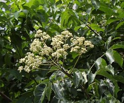 | 【備 考】学名/Evodia meliaefolia 別名/シマクロキ、ウラジロゴシュユ ミカン科ゴシュユ属 暖かい地方の海岸近くに生える常緑〜半落葉高木で、高さ15〜20m になる。樹皮にいぼ状の皮目があり、灰黒色。 葉は奇数羽状複葉で対生、小葉3〜9対、長さ6〜9cmのゆがんだ狭 卵形で、1cmほどの葉柄があり、表面に光沢を持つ。 7〜8月、枝先に緑白色で5弁の小さい花が多数集まって咲く。雌雄別 株。雄花には雄しべ5個、雌花には雄しべが1個。 果実は直径約7mmの球形で、5個の分果になる。 分布は三重県以西、中国、台湾など。 |