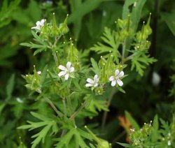 | 【備 考】学名/Geranium carolinianum フウロソウ科フウロソウ属 北アメリカ原産の1年草で、昭和初期に渡来した帰化植物。 野原や空き地などの市街地の道ばたに生え、高さ50cmほど。 葉が深く切れ込み、ほとんど基部まで5〜7裂する。茎には細い 毛が生えている。 花は小さく、直径1cm程度の5弁で、淡紅白色。4月ごろから 咲き始め、秋までポツポツと咲き続ける。花弁と萼片はほぼ同じ 長さ。種子に網目状の隆起した模様のあるのが特徴で、日本原産 のフウロソウ属では花弁が萼片より長く、種子は滑らか。 |