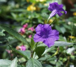 | 【備 考】学名/Ruellia macrantha キツネノマゴ科ルエリア属 熱帯アメリカ、アフリカ、アジア、オーストラリア、北アメリカなどに 約250種ほどが分布する属で、1年草・多年草・または小低木となる。 マクランタはブラジル原産の低木状多年草で、高さ2m近くまで育つが、 摘芯で分枝させると50cmほどで開花する。 ろうと状の花は先が5裂して開き、花の径3〜5cm。濃いピンク色の 花が多いが紫色の品種も最近鉢植えで販売されている。 |