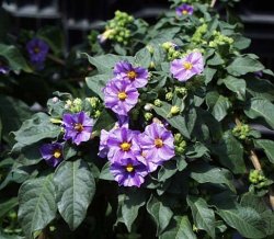 | 【備 考】学名/Solanum rantonnetii ナス科ソラヌム(ナス)属 この属の植物は熱帯から温帯に約1700種が分布する。草本または 低木、つる性になるものもある。 ラントネッティーはアルゼンチンからパラグアイ原産で、高さ1〜2 mになる低木。 夏、枝先に集散花序を作り、暗青色〜紫色の花をつける。中心のしべ の部は黄色。 |