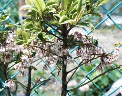 | 【備 考】学名/Ardisia crenata ヤブコウジ科ヤブコウジ属 暖地の林内に自生するが、庭木としても広く栽培されている。 日本から北インドまで分布する常緑の小低木で、放置すれば高さ 2mまで成長する。通常は0.5〜1mほど。 葉は長さ5〜12cmの長楕円形〜楕円状披針形、ふちに円鋸歯 があり波打っている。 花期7月、小枝の先に散房状をなして直径約8mmの花が多数つ き、花弁が外側に反り返り、色は白または薄いピンク、5深裂し ている。 果実は直径6mmほどの球形で、晩秋に赤く熟し長く残る。果実 が黄色のものや白いもの(千鳥白実)などの種類もある。 |