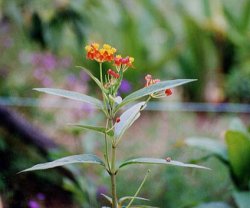 | 【備 考】学名/Asclepias tuberosa (crassavica) 別名/シュッコンパンヤ ガガイモ科アスクレピアス(トウワタ)属 南北アメリカに約120種がある多年草の属で、まれに亜低木もあり 茎や葉を傷つけると乳汁がでる。 ヤナギトウワタは北アメリカ原産の多年草で、高さ50〜80cm、 ヤナギに似た線状披針形の葉がほぼ互生する。 花は橙色・赤色・黄色の部分に分れ、茎の頂きまたは上部の葉腋に散 形花序を作る。温室では周年、露地植えでは夏に開花。 先のとがった長楕円形の果実の中には冠毛のついた種子がたくさん入 っている。 |