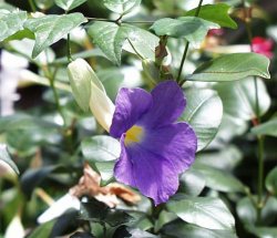 | 【備 考】学名/Thunbergia erecta 別名/コダチヤハズカズラ キツネノマゴ科ツンベルギア(ヤハズカズラ)属 この属はアフリカ、マダガスカル、熱帯・亜熱帯アジアなどに100種 以上がある直立性またはつる性の多年草あるいは低木で、葉腋に単生花 もしくは総状花序をつけるもの。花の基部に2枚の大きな苞がある。 明治12年に渡来したとされるが、花の色は白・黄・紫など多彩。 エレクタは熱帯西アフリカの原産で、つる性の小低木。葉は先が少しと がった卵形で対生し、葉腋から花枝をだして直径約4cmほどの青紫色 の花をつける。温室ではほぼ周年開花するが、戸外では夏から秋が盛期 となる。ラッパ状の花は先が5裂して平開、中央部が黄色い。 |