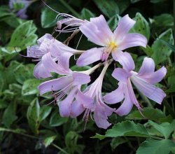 | 【備 考】学名/Lycoris sprengeri 別名/ムラサキキツネノカミソリ ヒガンバナ科リコリス(ヒガンバナ)属 日本や中国に12種が分布する耐寒性の球根植物で、花茎が直立して 頂きに散形花序をつけ、葉は根生で開花後に現れる特徴がある。 日本での代表格はマンジシャゲ(ヒガンバナ)である。 リコリス・スプレンゲリ(ムラサキキツネノカミソリ)は中国原産の 多年草で、ナツズイセンに似ており、花被片は反巻きしない。 花期8〜9月、高さ50cm程度の花茎の先に淡紅色の花を数個つけ る。葉は翌年の春に伸びて、花が咲く前に枯れる。 |