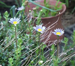 | 【備 考】学名/Felicia amelloides 別名/ブルーデージー、ブルーマーガレット キク科フェリキア(ルリヒナギク)属 南アフリカ原産。現地では高さ30〜90cmになる小低木だが、 日本などでは冬の寒さで枯れるので、多年草の扱いとなる。 分枝した長い花柄の頂きに頭花を単生し、花は直径3cmほどで 舌状花は淡青色、筒状花は黄色、その対比が美しい。 花期は路地植えでは5〜6月が主で、秋にも開花する。温室では 冬〜春が多い。 |