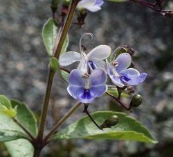 | 【備 考】学名/Clerodendrum ugandense クマツヅラ科クレロデンドルム(クサギ)属 この属の植物はほとんどが常緑の低木で、ときにつる性になる。花は 通常頂生で集散花序・円錐花序・または散房状につく。 ウガンデセはアフリカのウガンダから旧ローデシアに自生する低木で、 美しい空色と白色の混じった花は集散状に咲く。5弁で、しべの突出 が目立つ。花期は夏。 最近鉢植えで人気がある花で、地植えでも育つようである。 |