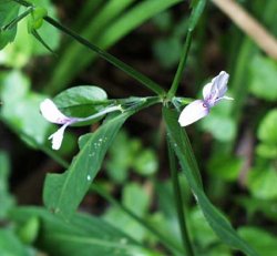 japonica キツネノマゴ科ハグロソウ属 山地の木陰に生える多年草で、まばらに枝分かれして高さ20〜 50cmになる。葉は長さ2〜10mmの柄を持ち、長さ2〜10 cmの卵状披針形または披針形、暗緑色で対生する。 夏に枝先または上部の葉腋に長さ5〜15mmの花柄を出し、2個 の葉状の広卵形の苞に包まれた紅紫色の花をつける。花冠は2唇形 で、通常下唇のほうが幅が広い。雄しべは2個。 |