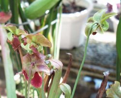 | 【備 考】学名/Sarracenia leucophylla 別名/アミメヘイシソウ サラセニア科サラセニア(ヘイシソウ)属 サラセニア科の植物は葉が変化して袋状となり、昆虫などが中に入ると 内部で消化吸収する食虫植物である。 サラセニア属はカナダから北アメリカ東部に8種がある。 袋状になった葉を瓶子葉といい、レウコフィラはこの先端が網目状にな るのでアミメヘイシソウの別名がある(写真でははっきりしない)。 花は暗赤色とされるが、園芸品種もいろいろ育てられ、同属の「フラウ ァ」や「ミノル」のような黄色〜帯赤色の花をつける品種もある。 |