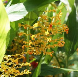 | 【備 考】学名/Globba schomburgkii ショウガ科グロッバ属 タイ、ベトナム原産の多年草で、草丈60〜70cm。 細い根茎があり、葉は長楕円形または披針形、長さ8〜20cm 幅3〜8cm。 花期は夏、頂生した花序を作り、花軸の苞腋に小花序を伸ばして 黄色い花を多数つける。花序は下垂する。 本邦では主に温室栽培。 |