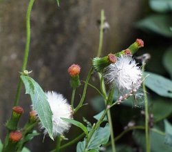 | 【備 考】学名/Emilia sonchifolia キク科ウスベニニガナ属 暖かい地方に見られる1年草で、よく似たベニバナボロギクに比べて 弱々しい印象を受ける。高さ25〜40cm。 下部の葉は切れ込みがあり、中ほどの葉は卵状披針形。葉柄に翼があ り、基部が茎を抱く。 花期3〜11月、枝先にピンク〜レンガ色の頭花が2〜5個つき、花 は筒状花だけからなる。蕾のときはうつむいている。 実には白い綿毛があって、風により遠くまで運ばれる。 |