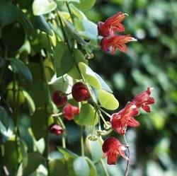 | 【備 考】学名/Aeschynanthus tricolor イワタバコ科エスキナンツス属 146属2400種ほどあるというイワタバコ科の植物の中でエスキナ ンツス属はインド〜熱帯アジア〜ニューギニアに約100種が分布する もの。木や岩に着生する常緑多年草または低木、蔓性など。 トリコロルは枝が下垂して育ち、葉は全縁で卵形、革質でやや肉厚、対 生する。 花は葉腋や茎先に1〜2個つき、濃赤色〜赤褐色で、筒状の花冠が萼か ら突出し、先端は2唇形で上唇は2裂、下唇は3裂していて、雄しべが 少し花冠から覗いて見える。温室栽培ではほぼ周年咲く。 |