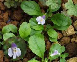 | 【備 考】学名/Mazus pumilus(japonicus) ゴマノハグサ科サギゴケ属 日本全土で道端や畑などにごく普通に生える1年草。 茎は根元に集まり、葉は倒卵形で茎の下部では長さ2〜5cmと 大きく、上部では小さくて、浅い鋸歯を持つ。 葉の間から伸びる茎は6〜20cmほどになる。 花はほとんど1年中つけ、伸びた茎先にまばらに咲く。長さ1cm ほどの小さい花で、上唇は紫色、下唇はやや紫色を帯びた白色で、 黄色と赤褐色の斑紋を持つ。 ムラサキサギゴケに似ているが、これの花期は春であり、トキワハ ゼは走出枝を持たないところが異なる。 |