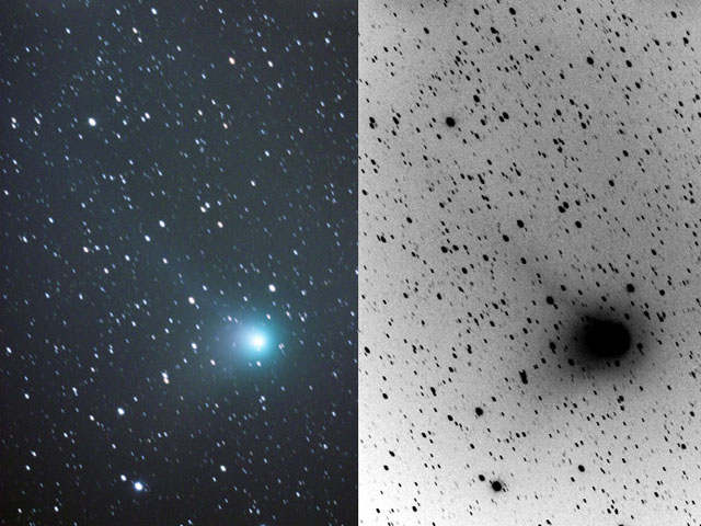 @D=18cmF4ライトシュミット鏡筒で撮影(淡いながらも尾がまだ写る) ![]() @23h23m-23h52m (7分×4枚) ↓上画像から反転画像を作り、合成したものです↓ ![]() |