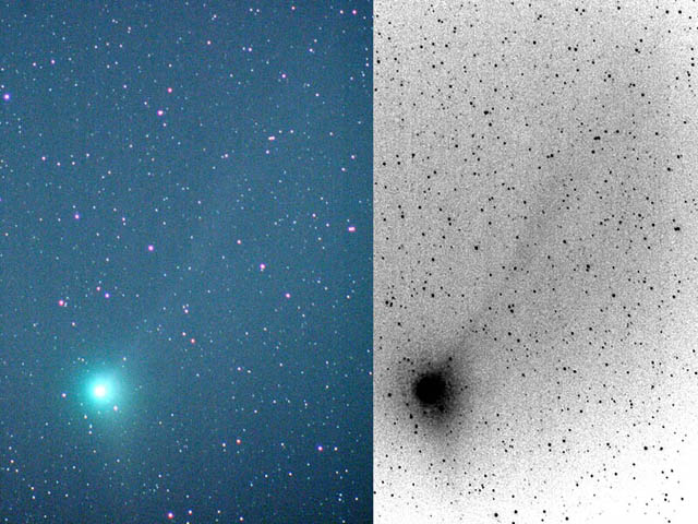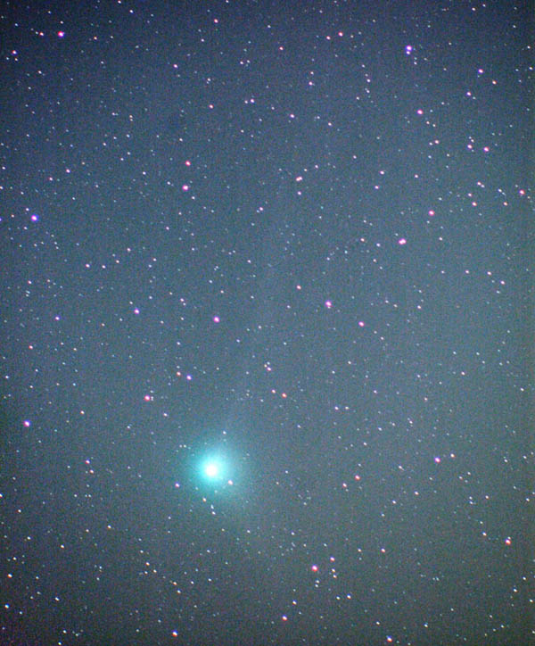 既に南中をとっくに過ぎており、彗星は低空飛行状態!またも観察時間が遅すぎました(悔しい!)その後、天候は回復していたことにまたも気付くのが遅れ、午前2時頃慌てて望遠鏡を外に出して撮影。 |