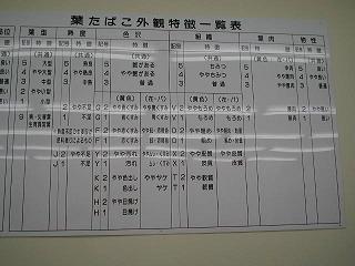 「葉たばこ外観特徴一覧表」です。 葉型、熟度、色沢、組織、葉肉 等の特徴が記号化されております。 |