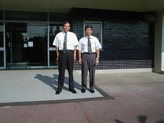 「JT中四国原料本部」玄関にて、、、 私と「水岡理事さん」、、、うむー、足の長さを比較されてるみたい。。。(汗) |